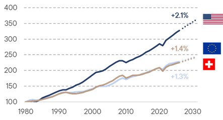 Der Internationale Währungsfonds (IWF) erwartet für dieses Jahr ein reales globales BIP-Wachstum von +2.1% für die USA, +1.4% für Europa und +1.3% für die Schweiz.[1] Auch das Zinsniveau unterstützt die gute Lage mit vorteilhafteren Finanzierungsniveaus.