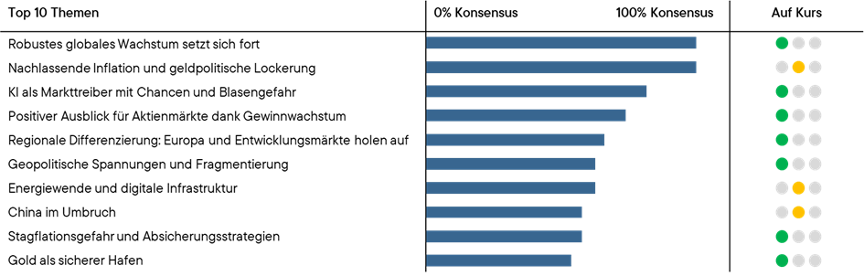 Obwohl wir noch im ersten Quartal des Jahres sind, kam die Idee auf, die Marktprognosen aus unserem AK Nr. 45 - Ausblick der Ausblicke 2026 heranzuziehen und eine erste Standortbestimmung zu machen. Wir dachten, es ist am einfachsten, unsere Einschätzung mit einem Ampelsystem auf der rechten Seite des nachfolgenden Schaubilds zu geben, ohne komplexe Analysen anzuführen. Alles in allem scheint das Jahr bisher so zu verlaufen, wie es von vielen Marktteilnehmern vorgängig eingeschätzt wurde.